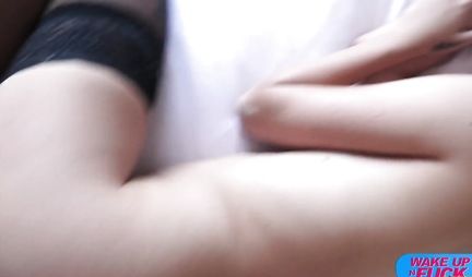 Парень разбудил красотку в чулках для двойного проникновения и оргазма