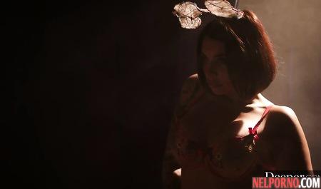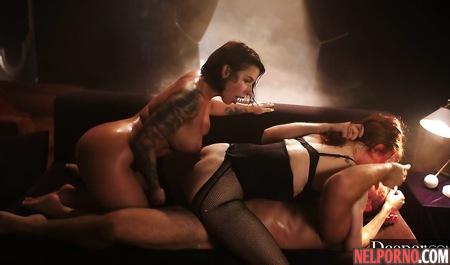 Татуированная брюнетка и рыжая красотка занимаются групповым сексом с брюнетом